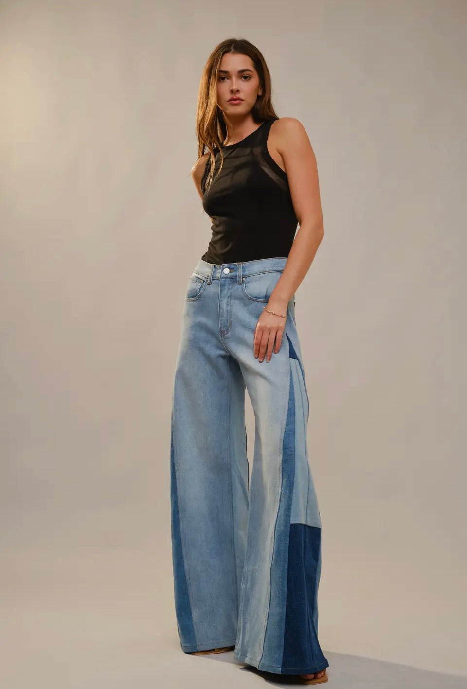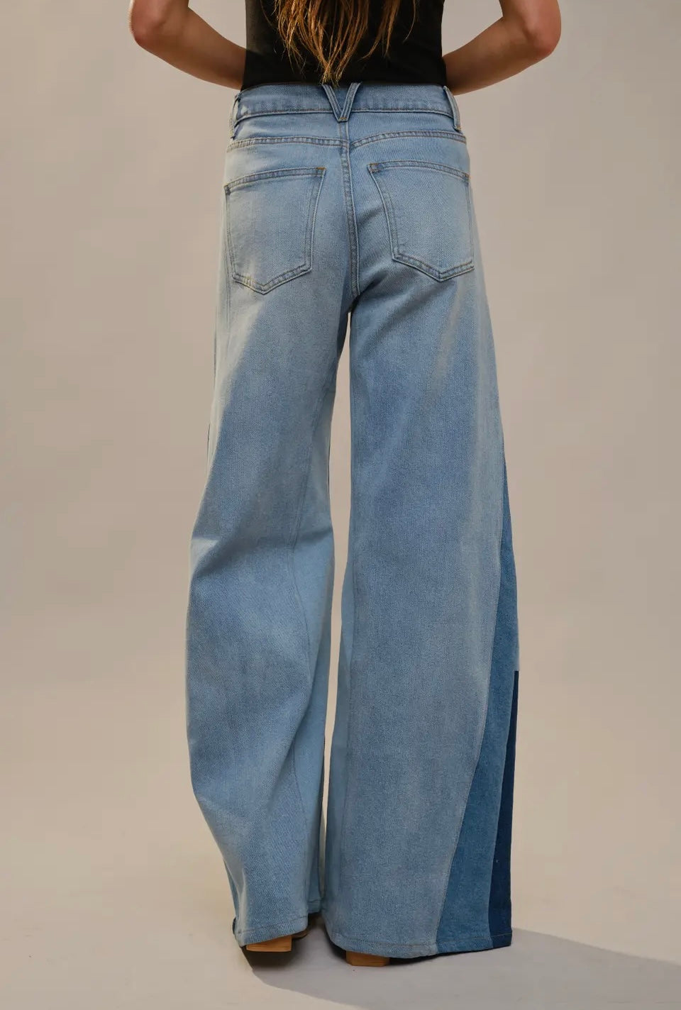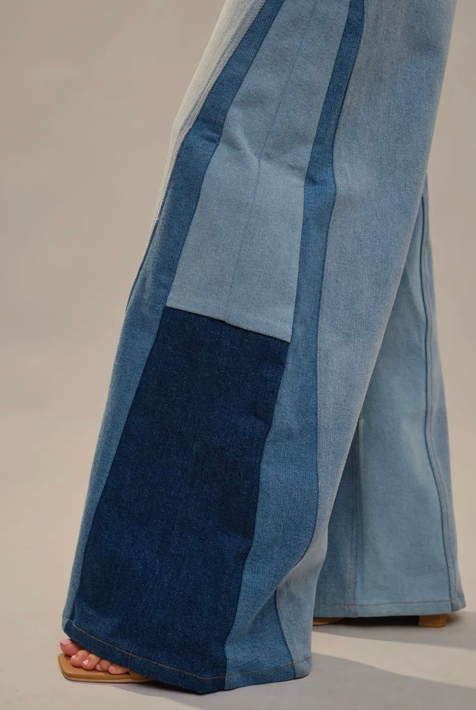 super wide with bold two tone block paneling along the sides; medium washed jeans.